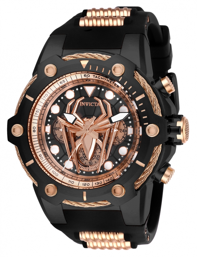 Black stainless steel case with a two-tone (black and rose goldr-tone) silicone, polyurethane and stainless steel strap. Fixed black and rose gold-tone stainless steel bezel. Black dial with rose gold-tone hands and index hour markers. Tachymeter scale around the outer rim. Dial Type: Analog. Luminescent hands and markers. Chronograph - sub-dials displaying: three - 60 second, 60 minute and 24 hour. Hattori Caliber VD54 quartz movement. Scratch resistant flame fusion crystal. Pull / push crown. Solid case back. Round case shape, case size: 51 mm, case thickness: 18 mm. Band width: 30 mm, band length: 8.25 inches. Buckle clasp. Water resistant at 100 meters / 330 feet. Functions: chronograph, GMT, second time zone, hour, minute, second. Sport watch style. Watch label: Japan Movt. Invicta Marvel Spiderman Chronograph Black Dial Mens Watch 26918.