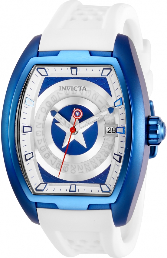 Blue stainless steel case with a white silicone strap. Fixed blue stainless steel bezel. Blue dial with blue hands and index hour markers. Minute markers around the outer rim. Dial Type: Analog. Luminescent hands and markers. Date display at the 3 o'clock position. SII Caliber NH35A automatic movement with a 41-hour power reserve. Scratch resistant flame fusion crystal. Pull / push crown. Solid case back. Tonneau case shape, case size: 42 mm x 46 mm, case thickness: 17 mm. Band width: 22 mm, band length: 9 inches. Buckle clasp. Water resistant at 100 meters / 330 feet. Functions: date, hour, minute, second. Casual watch style. Watch label: Japan Movt. Invicta Marvel Captain America Automatic Blue Dial Mens Watch 26947.
