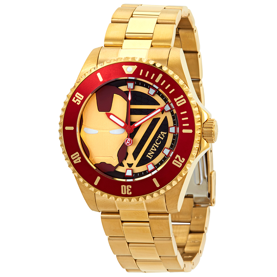 Gold-tone stainless steel case with a gold-tone stainless steel bracelet. Red stainless steel bezel. Black dial with red hands and index hour markers. Dial Type: Analog. Luminescent hands and markers. TMI Caliber PC21J quartz movement. Scratch resistant mineral crystal. Pull / push crown. Solid case back. Round case shape. Case size: 44 mm. Band width: 22 mm, band length: 8.25 inches. Fold over clasp. Water resistant at 100 meters / 330 feet. Functions: hour, minute, second. Casual watch style. Watch label: Japan Movt. Invicta Marvel Ironman Black Dial Mens Watch 29678.