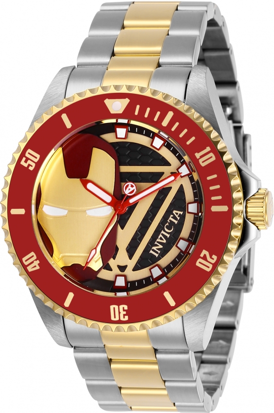 Stainless steel case with a two-tone (silver-tone and yellow gold-tone) stainless steel bracelet. Uni-directional rotating yellow gold-tone bezel with an inlaid red ring. Black (Ironman) dial with luminous red hands and index hour markers. Minute markers around the outer rim. Dial Type: Analog. Luminescent hands and markers. TMI caliber PC21J quartz movement. Scratch resistant mineral crystal. Pull / push crown. Solid case back. Round case shape. Case size: 44 mm. Case thickness: 15 mm. Band width: 22 mm. Band length: 8.25 inches. Fold over clasp. Water resistant at 100 meters / 330 feet. Functions: hour, minute, second. Marvel Series. Casual watch style. Watch label: Japan Movt. Invicta Marvel Ironman Black Dial Two-tone Mens Watch 29679.