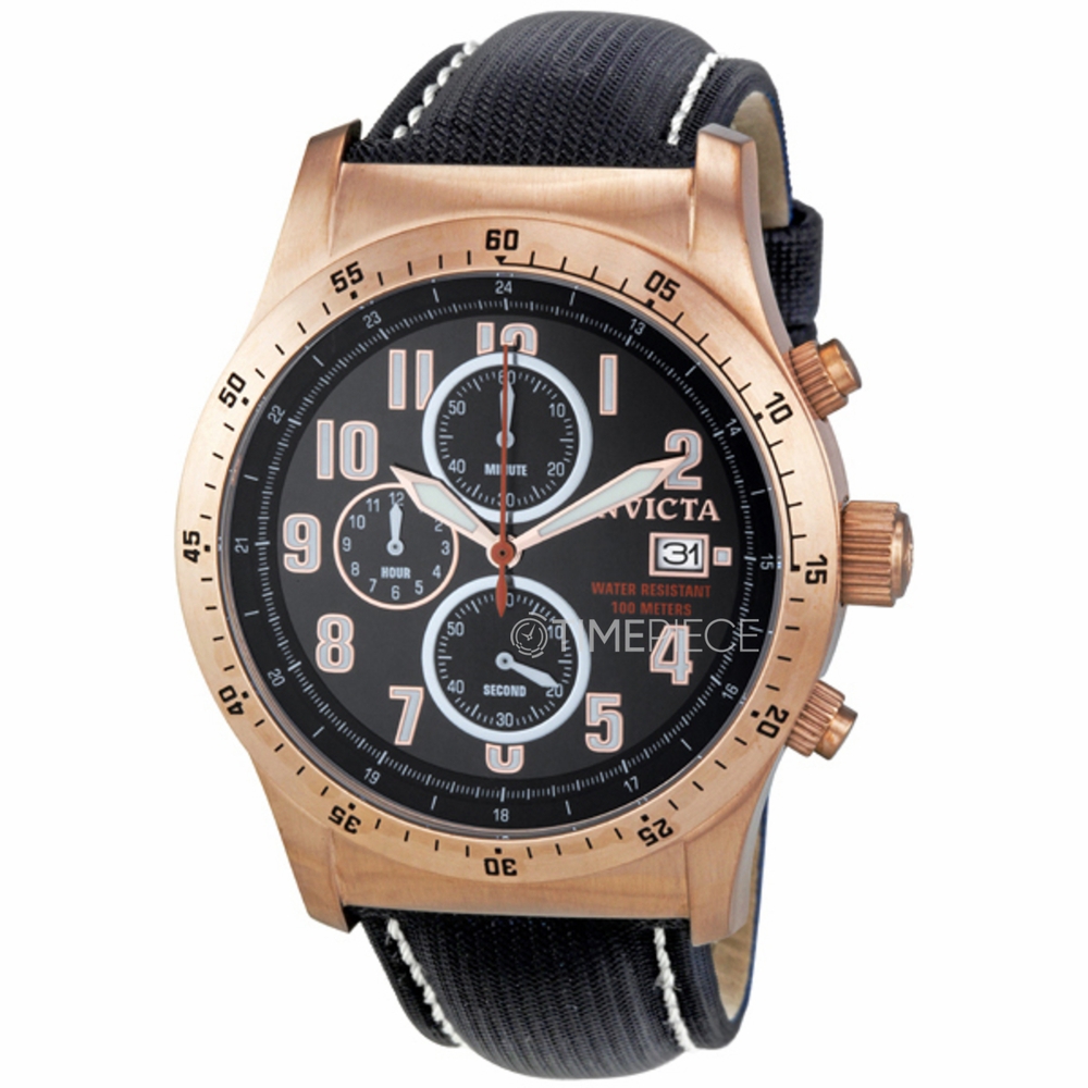 Rose gold-tone stainless steel case with a black nylon and leather strap. Fixed rose gold-tone stainless steel bezel. Black dial with luminous hands and Arabic numeral hour markers. Markers around the outer rim. military time scale. Dial Type: Analog. Luminescent hands and markers. Date display at the 3 o'clock position. Chronograph - three sub-dials displaying: 60 seconds, 60 minutes and 12 hours. Hattori Caliber VK67A quartz movement. Scratch resistant flame fusion crystal. Pull / push crown. Solid case back. Round case shape, case size: 44 mm, case thickness: 12 mm. Band width: 24 mm, band length: 10 inches. Tang clasp. Water resistant at 100 meters / 330 feet. Functions: hours, minutes, seconds, chronograph, date. Specialty Series. Sport watch style. Watch label: Japan Movt. Invicta Military Chronograph Rose Gold-tone Black Dial Mens Watch 1319.