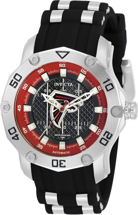 Silver-tone stainless steel case with a two-tone (silver-tone and black) stainless steel and silicone strap. Uni-directional rotating black and silver stainless steel bezel. Black dial with silver-tone hands and index hour markers. Minute markers around the outer rim. Dial Type: Analog. Luminescent hands and markers. Miyota Caliber 821A-21D(3W) Automatic movement, containing 21 Jewels, bitting at 21600 vph, and has a power reserve of approximately 42 hours. Scratch resistant Flame Fusion crystal. Pull / push crown. Transparent see through case back. Round case shape, case size: 38 mm, case thickness: 13.15 mm. Band width: 26 mm, band length: 7.50 inches. Buckle clasp. Water resistant at 100 meters / 330 feet. Functions: hour, minute, second. Nfl Series. Casual watch style. Watch label: Japan Movt. Invicta NFL Atlanta Falcons Automatic Black Dial Ladies Watch 32874.