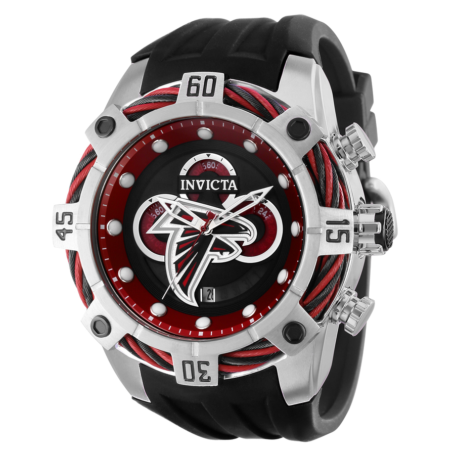 Silver-tone stainless steel case with a black silicone strap. Silver and red and black stainless steel and cable bezel. White and red and black dial with silver-tone hands and index hour markers. Minute markers around the outer rim. Dial Type: Analog. Luminescent hands and markers. Date display at the 6 o'clock position. Chronograph - three sub-dials displaying: 60 second, 60 minute and 24 hour. SII Caliber VD52 quartz movement. Scratch resistant Flame Fusion crystal. Pull / push crown. Solid case back. Round case shape, case size: 52 mm. Band width: 32 mm, band length: 8.25 inches. Buckle clasp. Water resistant at 100 meters / 330 feet. Functions: chronograph, date, hour, minute, second. Nfl Series. Casual watch style. Watch label: Japan Movt. Invicta NFL Atlanta Falcons Green Dial Mens Watch 35813.