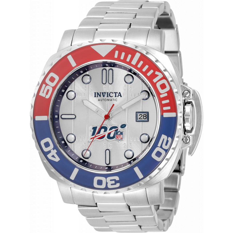 Silver-tone stainless steel case and bracelet. Red and blue (pepsi) stainless steel bezel. Silver dial with silver-tone hands and index hour markers. Minute markers around the outer rim. Dial Type: Analog. Luminescent hands and markers. Date display at the 3 o'clock position. SII Caliber NH35A Automatic movement, containing 24 Jewels, bitting at 21600 vph, and has a power reserve of approximately 41 hours. Scratch resistant Flame Fusion crystal. Pull / push crown. Transparent see through case back. Round case shape, case size: 48 mm, case thickness: 16.5 mm. Band width: 24 mm, band length: 7 inches. Fold over clasp. Water resistant at 100 meters / 330 feet. Functions: date, hour, minute, second. Nfl Series. Casual watch style. Watch label: Japan Movt. Invicta NFL Automatic Silver Dial Pepsi Bezel Mens Watch 34355.
