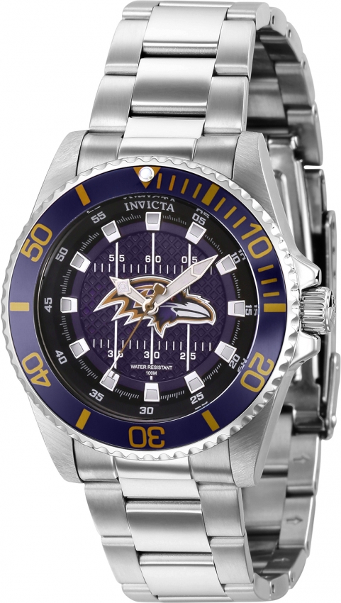 Silver-tone stainless steel case and bracelet. Uni-directional rotating silver-tone and purple and brown stainless steel bezel. Purple and brown and white and black dial with silver-tone hands and index hour markers. Minute markers around the outer rim. Dial Type: Analog. Luminescent hands and markers. Hattori Caliber PC21 quartz movement. Scratch resistant Flame Fusion crystal. Pull / push crown. Solid case back. Round case shape, case size: 38 mm. Band width: 20 mm, band length: 7.50 inches. Deployment clasp. Water resistant at 100 meters / 330 feet. Functions: hour, minute, second. Nfl Series. Casual watch style. Watch label: Japan Movt. Invicta NFL Baltimore Ravens Quartz Purple Dial Ladies Watch 36938.