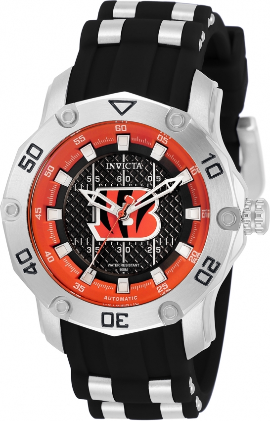 Stainless steel case with a black silicone strap with stainless steel barrel inserts. Uni-directional rotating stainless steel bezel. Orange and black dial with silver-tone hands and index hour markers. Minute markers around the outer rim. Dial Type: Analog. Luminescent hands and markers. Miyota Caliber 821A-21D(3W) Automatic movement, containing 21 Jewels, bitting at 21600 vph, and has a power reserve of approximately 42 hours. Scratch resistant Flame Fusion crystal. Pull / push crown. Transparent case back. Round case shape. Case size: 38 mm. Band width: 20 mm. Band length: 7.75 inches. Tang clasp. Water resistant at 100 meters / 330 feet. Functions: hour, minute, second. Nfl Series. Casual watch style. Watch label: Japan Movt. Invicta NFL Cincinnati Bengals Automatic Orange and Black Dial Ladies Watch 33055.