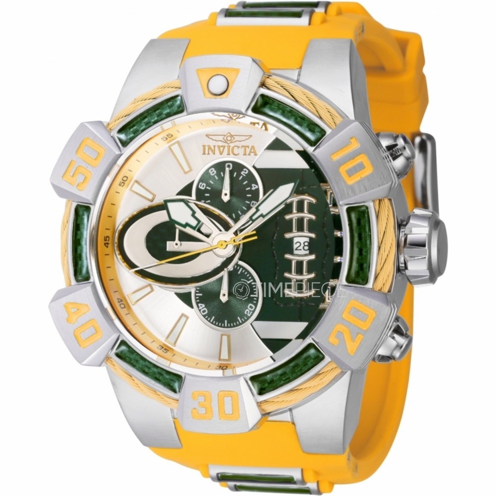Silver-tone stainless steel case with a two-tone (yellow and grey) glass fiber and silicone strap. Fixed three-tone (grey and yellow and silver) cable and stainless steel bezel. Grey and silver dial with green hands and index hour markers. Minute markers around the outer rim. Dial Type: Analog. Luminescent hands and markers. Date display at the 6 o'clock position. Chronograph - three sub-dials displaying: 60 second, 60 minute and 1/10th of a second. Hattori Caliber VD57 quartz movement. Scratch resistant Flame Fusion crystal. Pull / push crown. Solid case back. Round case shape, case size: 52 mm, case thickness: 20.1 mm. Band width: 30 mm, band length: 8.25 inches. Buckle clasp. Water resistant at 100 meters / 330 feet. Functions: chronograph, date, hour, minute, second. Nfl Series. Sport watch style. Watch label: Japan Movt. Invicta NFL Green Bay Packers Chronograph Quartz Mens Watch 41598.