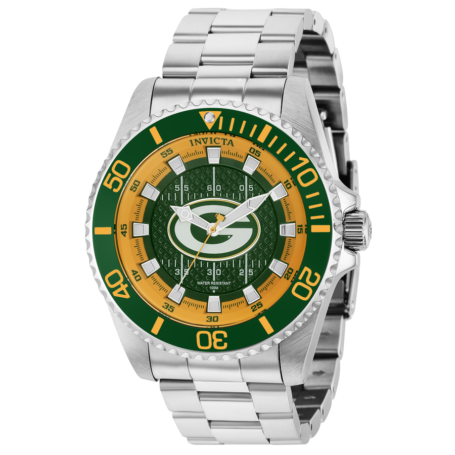 Silver-tone stainless steel case and bracelet. Green, orange bezel. Green, orange dial with silver-tone hands and index hour markers. Minute markers around the outer rim. Dial Type: Analog. Luminescent hands and markers. Caliber PC21 quartz movement. Scratch resistant Flame Fusion crystal. Pull / push crown. Solid case back. Round case shape, case size: 47 mm. Deployment clasp. Water resistant at 100 meters / 330 feet. Functions: hour, minute, second. Nfl Green Bay Packers Series. Invicta NFL Green Bay Packers Quartz Mens Watch 36929.