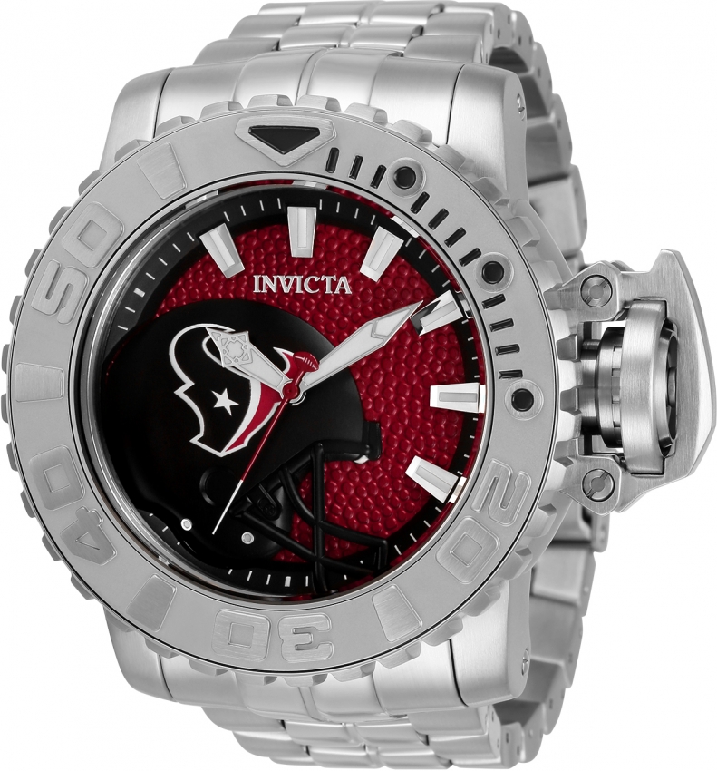 Silver-tone stainless steel case and bracelet. Silver-tone stainless steel bezel. Red dial with silver-tone hands and index hour markers. Minute markers around the outer rim. Dial Type: Analog. Luminescent hands and markers. SII Caliber NH35A Automatic movement, containing 24 Jewels, bitting at 21600 vph, and has a power reserve of approximately 41 hours. Scratch resistant Flame Fusion crystal. Pull / push crown. Transparent see through case back. Round case shape, case size: 58 mm, case thickness: 23.5 mm. Band width: 30 mm, band length: 8.25 inches. Fold over clasp. Water resistant at 200 meters / 660 feet. Functions: hour, minute, second. Nfl Series. Casual watch style. Watch label: Japan Movt. Invicta NFL Houston Texans Automatic Red Dial Mens Watch 33008.