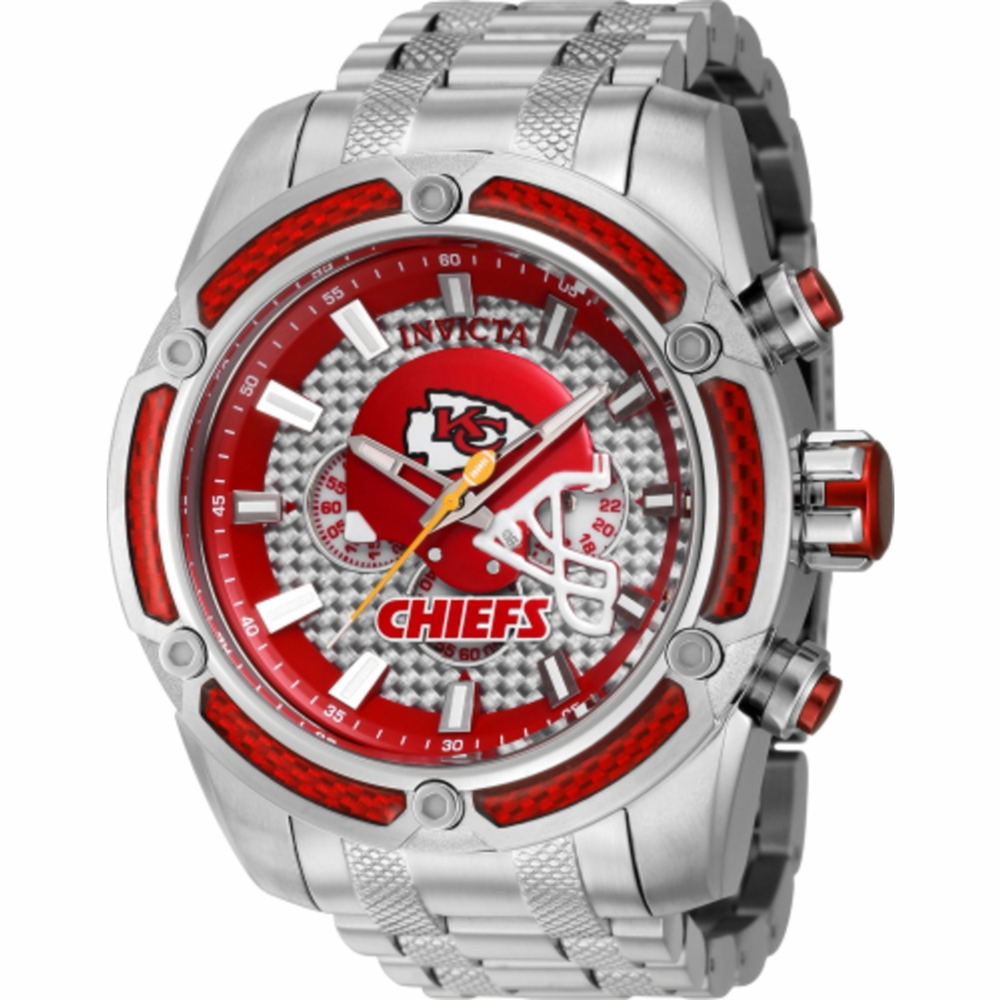 Silver-tone stainless steel case and bracelet. Fixed two-tone (silver and red) glass fiber and stainless steel bezel. Red dial with silver-tone hands and index hour markers. Minute markers around the outer rim. Dial Type: Analog. Luminescent hands and markers. Chronograph - three sub-dials displaying: 60 second, 60 minute and 24 hour. Hattori Caliber VD54 quartz movement. Scratch resistant Flame Fusion crystal. Pull / push crown. Solid case back. Round case shape, case size: 52 mm, case thickness: 19.7 mm. Band width: 26 mm, band length: 7.75 inches. Fold over safety clasp. Water resistant at 100 meters / 330 feet. Functions: chronograph, GMT, second time zone, hour, minute, second. Nfl Series. Sport watch style. Watch label: Japan Movt. Invicta NFL Kansas City Chiefs Chronograph Quartz Red Dial Mens Watch 41797.