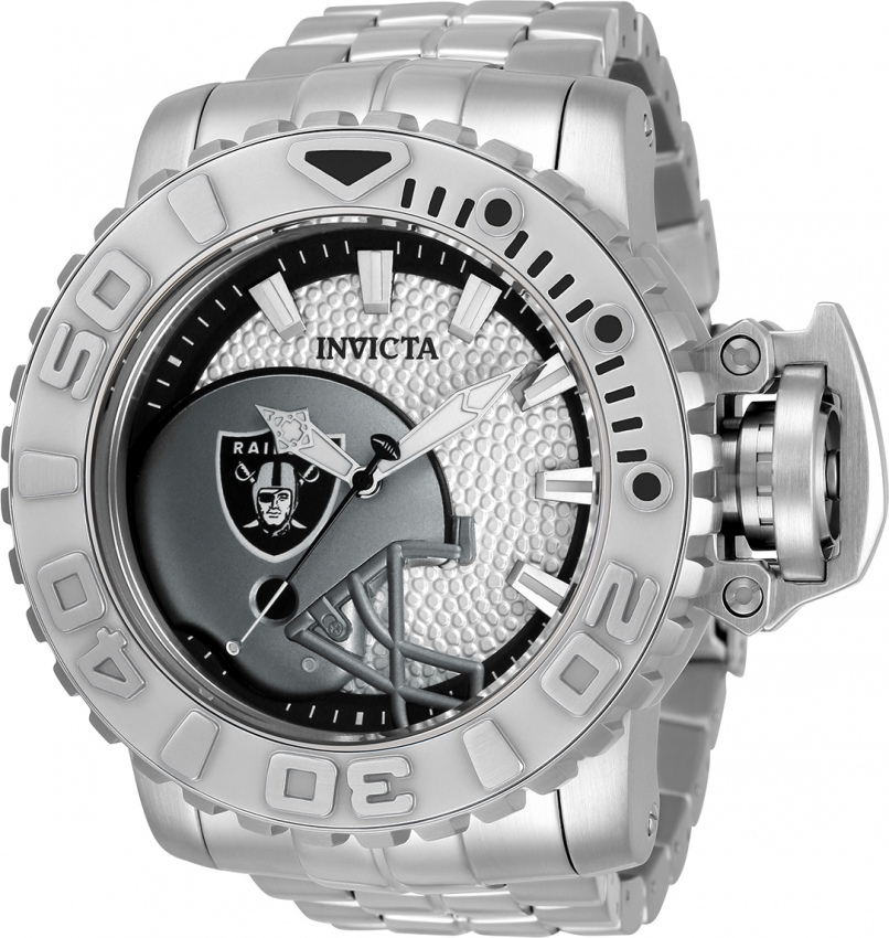 Silver-tone stainless steel case and bracelet. Silver-tone stainless steel bezel. White dial with silver-tone hands and index hour markers. Minute markers around the outer rim. Dial Type: Analog. Luminescent hands and markers. SII Caliber NH35A Automatic movement, containing 24 Jewels, bitting at 21600 vph, and has a power reserve of approximately 41 hours. Scratch resistant Flame Fusion crystal. Pull / push crown. Transparent see through case back. Round case shape, case size: 58 mm, case thickness: 23.5 mm. Band width: 30 mm, band length: 8.25 inches. Fold over clasp. Water resistant at 200 meters / 660 feet. Functions: hour, minute, second. Nfl Series. Casual watch style. Watch label: Japan Movt. Invicta NFL Las Vegas Raiders Automatic White Dial Mens Watch 33030.