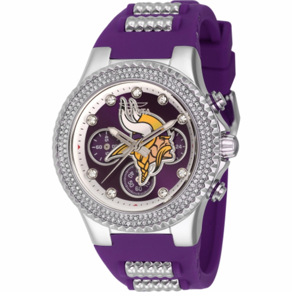 Silver-tone stainless steel case with a two-tone (purple and silver-tone) silicone and stainless steel strap. Silver-tone crystal and stainless steel bezel. Purple dial with silver-tone hands and crystal hour markers. Minute markers around the outer rim. Dial Type: Analog. Luminescent hands. Chronograph - three sub-dials displaying: 60 second, 60 minute and 24 hour. Hattori Caliber VD54 quartz movement. Scratch resistant Flame Fusion crystal. Pull / push crown. Solid case back. Round case shape, case size: 39 mm. Band width: 22 mm, band length: 7.50 inches. Buckle clasp. Water resistant at 100 meters / 330 feet. Functions: chronograph, GMT, second time zone, hour, minute, second. Nfl Series. Sport watch style. Watch label: Japan Movt. Invicta NFL Minnesota Vikings Chronograph Quartz Crystal Purple Dial Ladies Watch 42741.