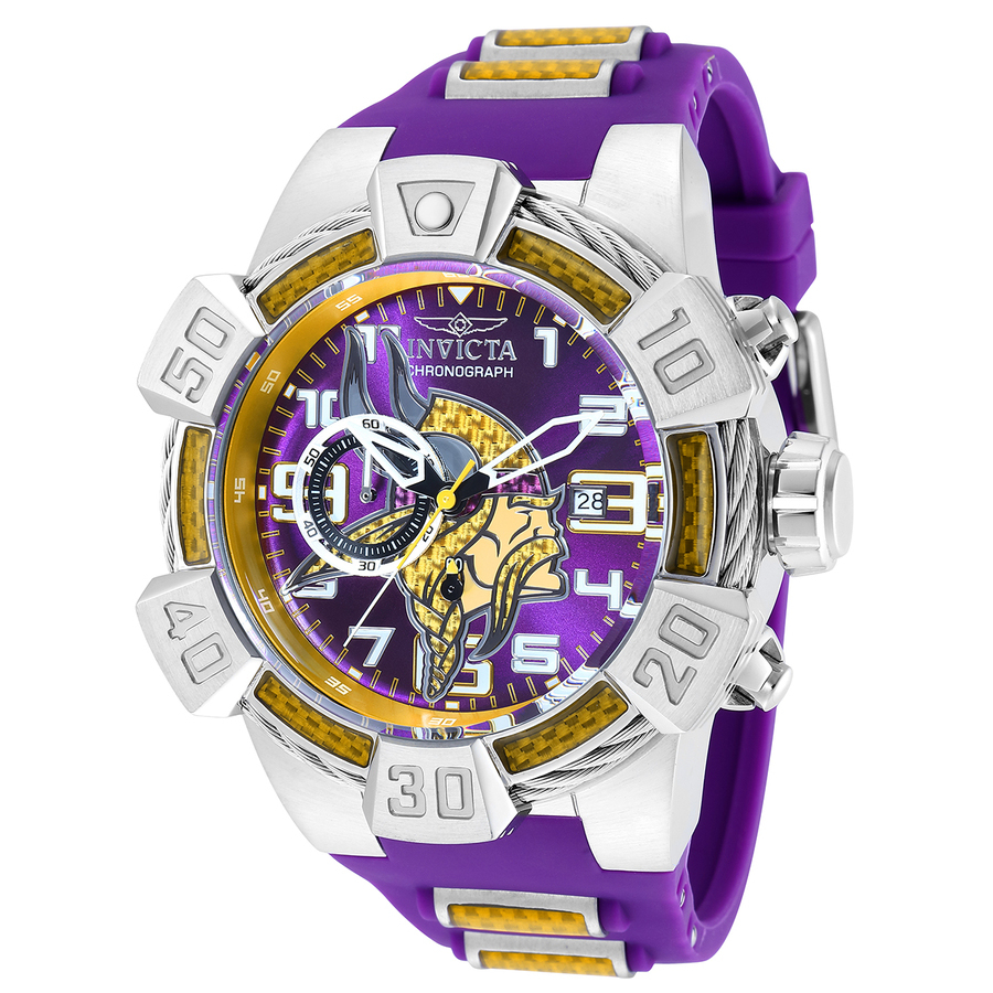 Silver-tone stainless steel case with a purple, yellow and silver silicone strap. Fixed silver and yellow stainless steel and cable bezel. Purple dial with silver-tone hands and Arabic numeral hour markers. Minute markers around the outer rim. Dial Type: Analog. Luminescent hands and markers. Date display at the 3 o'clock position. Chronograph - two sub-dials displaying: 60 second and 60 minute. TMI Caliber VD5F quartz movement. Scratch resistant Flame Fusion crystal. Pull / push crown. Solid case back. Round case shape, case size: 52 mm. Band width: 30 mm, band length: 8.25 inches. Buckle clasp. Water resistant at 100 meters / 330 feet. Functions: chronograph, date, hour, minute, second. Nfl Series. Casual watch style. Watch label: Japan Movt. Invicta NFL Minnesota Vikings Men Purple Dial Mens Watch 35868.