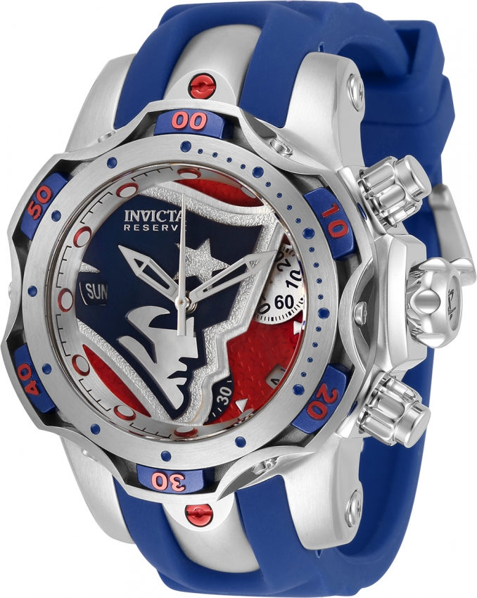 Silver-tone and red and dark blue stainless steel and aluminum case with a blue and silver-tone and red stainless steel and silicone and aluminium strap. Uni-directional rotating silver-tone and blue and red stainless steel and aluminum bezel. Red and blue and silver dial with silver-tone hands and index hour markers. Minute markers around the outer rim. Dial Type: Analog. Luminescent hands and markers. Date display at the 4 o'clock position. Three sub-dials displaying: day, 60 second and 30 minute. Ronda Caliber Z60 quartz movement. Scratch resistant Flame Fusion crystal. Screw down crown. Solid case back. Round case shape, case size: 44.40 mm, case thickness: 20 mm. Band width: 20 mm, band length: 7.25 inches. Buckle clasp. Water resistant at 1000 meters / 3300 feet. Functions: chronograph, date, day, hour, minute, small second. Nfl Series. Dive watch style. Watch label: Swiss Movt. Invicta NFL New England Chronograph Quartz Ladies Watch 33091.