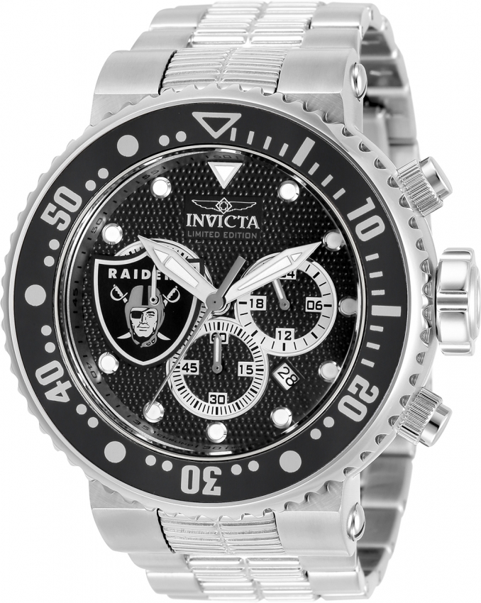 Two-tone (silver-tone and black) stainless steel and aluminum case with a silver-tone stainless steel bracelet. Two-tone (silver-tone and black) stainless steel and aluminum bezel. Black and antique silver and white dial with silver-tone hands and index hour markers. Minute markers around the outer rim. Dial Type: Analog. Luminescent hands and markers. Date display between 4 and 5 o'clock position. Chronograph - three sub-dials displaying: 60 second, 60 minute and 24 hour. Hattori Caliber VD53 quartz movement. Scratch resistant mineral crystal. Screw down crown. Solid case back. Round case shape, case size: 52 mm, case thickness: 20 mm. Band width: 29.8 mm, band length: 8.25 inches. Fold over clasp. Water resistant at 200 meters / 660 feet. Functions: chronograph, date, GMT, second time zone, hour, minute, second. Nfl Series. Sport watch style. Watch label: Japan Movt. Invicta NFL Oakland Raiders Chronograph Quartz Mens Watch 33139.