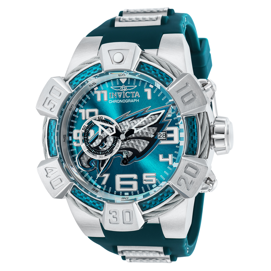 Stainless steel case with a green silicone strap with glass fiber inserts. Fixed stainless steel bezel with a green glass fiber inlay and silver-tone cable wire trim. Dark green (Philadelphia Eagles) dial with silver-tone skeleton hands and Arabic numeral hour markers. Minute markers. Arabic numeral minute markers (at 5 minute intervals) around the outer rim. Dial Type: Analog. Date display at the 3 o'clock position. Chronograph - two sub-dials displaying: 60 second and 60 minute. TMI caliber VD5F quartz movement. Scratch resistant Flame Fusion crystal. Pull / push crown. Solid case back. Round case shape. Case size: 52 mm. Case thickness: 19 mm. Band width: 30 mm. Band length: 8.25 inches. Tang clasp. Water resistant at 100 meters / 330 feet. Functions: chronograph, date, hour, minute, second. Nfl Series. Casual watch style. Watch label: Japan Movt. Invicta NFL Philadelphia Eagles Blue Dial Mens Watch 35784.