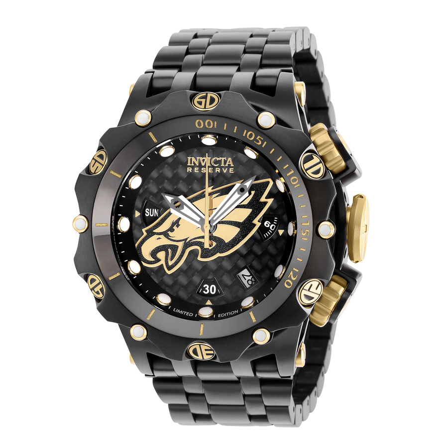 Black-plated stainless steel case and bracelet. Uni-directional rotating black-plated bezel. Black (Philadelphia Eagles) dial with silver-tone hands and dot hour markers. Minute markers around the outer rim. Dial Type: Analog. Luminescent hands and markers. Date display between the 4 and 5 o'clock positions. Chronograph - two displays showing: 60 second and 30 minute. Day of the week display. Ronda caliber Z60 quartz movement. Scratch resistant Flame Fusion crystal. Screw down crown. Solid case back. Round case shape. Case size: 51 mm. Case thickness: 20.15 mm. Band width: 31 mm. Band length: 8.25 inches. Fold over clasp. Water resistant at 500 meters / 1650 feet. Functions: chronograph, date, day, hour, minute, small second. NFL Series. Dive watch style. Watch label: Swiss Movt. Invicta NFL Philadelphia Eagles Chronograph Quartz Mens Watch 36177.