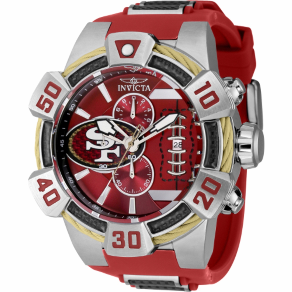 Silver-tone stainless steel case with a two-tone (red and black) glass fiber and silicone strap. Fixed multi-tone (brown and silver and red and gunmetal) cable and stainless steel bezel. Red dial with red hands and index hour markers. Minute markers around the outer rim. Dial Type: Analog. Luminescent hands and markers. Date display at the 3 o'clock position. Chronograph - three sub-dials displaying: 60 second, 60 minute and 1/10th of a second. Hattori Caliber VD57 quartz movement. Scratch resistant Flame Fusion crystal. Pull / push crown. Solid case back. Round case shape, case size: 52 mm. Band width: 30 mm, band length: 8.25 inches. Buckle clasp. Water resistant at 100 meters / 330 feet. Functions: chronograph, date, hour, minute, second. Nfl Series. Sport watch style. Watch label: Japan Movt. Invicta NFL San Francisco 49ers Chronograph Quartz Red Dial Mens Watch 41579.