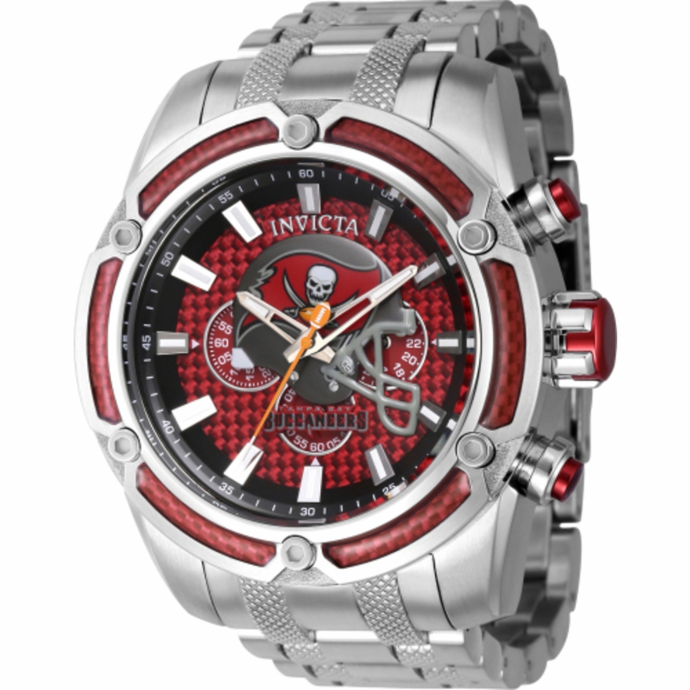 Silver-tone stainless steel case and bracelet. Fixed two-tone (silver and red) glass fiber and stainless steel bezel. Red dial with silver-tone hands and index hour markers. Minute markers around the outer rim. Dial Type: Analog. Luminescent hands and markers. Chronograph - three sub-dials displaying: 60 second, 60 minute and 24 hour. Hattori Caliber VD54 quartz movement. Scratch resistant Flame Fusion crystal. Pull / push crown. Solid case back. Round case shape, case size: 52 mm, case thickness: 19.7 mm. Band width: 26 mm, band length: 7.75 inches. Fold over safety clasp. Water resistant at 100 meters / 330 feet. Functions: chronograph, GMT, second time zone, hour, minute, second. Nfl Series. Sport watch style. Watch label: Japan Movt. Invicta NFL Tampa Bay Buccaneers Chronograph Quartz Red Dial Mens Watch 41811.