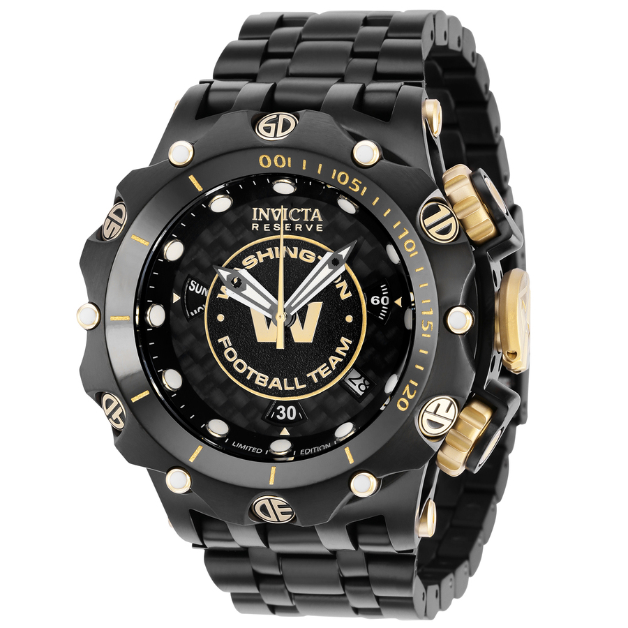 Two-tone (black and gold-tone) stainless steel case with a black stainless steel bracelet. Uni-directional rotating two-tone (black and gold-tone) stainless steel bezel. Two-tone (black and gold-tone) dial with black hands and index hour markers. Minute markers around the outer rim. Dial Type: Analog. Luminescent hands and markers. Date display between 4 and 5 o'clock position. Three sub-dials displaying: day, 60 second and 30 minute. Ronda Caliber Z60 quartz movement. Scratch resistant Flame Fusion crystal. Screw down crown. Solid case back. Round case shape, case size: 51 mm, case thickness: 20.15 mm. Band width: 31 mm, band length: 8.25 inches. Fold over clasp. Water resistant at 500 meters / 1650 feet. Functions: chronograph, date, day, hour, minute, small second. Nfl Series. Dive watch style. Watch label: Swiss Movt. Invicta NFL Washington Redskins Chronograph Quartz Mens Watch 36182.