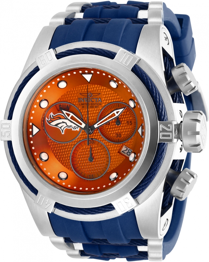 Silver-tone stainless steel case with a two-tone (blue and silver-tone) stainless steel and silicone strap. Uni-directional rotating two-tone (blue and silver-tone) stainless steel bezel. Orange dial with blue hands and index hour markers. Minute markers around the outer rim. Dial Type: Analog. Luminescent hands and markers. Date display at the 4 o'clock position. Chronograph - sub-dials displaying: three - week, 60 second, 30 minute. Ronda Caliber Z60 quartz movement. Scratch resistant mineral crystal. Screw down crown. Solid case back. Round case shape, case size: 53 mm, case thickness: 21 mm. Band width: 35 mm, band length: 8.25 inches. Buckle clasp. Water resistant at 200 meters / 660 feet. Functions: chronograph, date, day, hour, minute, small second. Sport watch style. Watch label: Swiss Movt. Invicta NFL Denver Broncos Chronograph Quartz Orange Dial Mens Watch 30232.