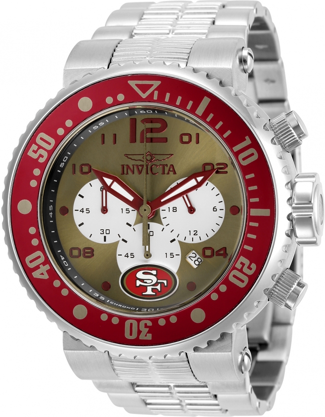 Stainless steel case with a stainless steel bracelet. Uni-directional rotating stainless steel bezel with a red aluminum ring. Gold dial with luminous silver-tone hands and Arabic numeral and dot hour markers. Minute markers around the outer rim. Dial Type: Analog. Luminescent hands and markers. Date display between the 4 and 5 o'clock positions. Chronograph - three white sub-dials displaying: 60 second, 60 minute and 24 hour. Hattori caliber VD53 quartz movement. Scratch resistant mineral crystal. Screw down crown. Solid case back. Round case shape. Case size: 52 mm. Case thickness: 20 mm. Band width: 29.8 mm. Band length: 8.25 inches. Fold over clasp. Water resistant at 200 meters / 660 feet. Functions: chronograph, date, GMT, second time zone, hour, minute, second. Sport watch style. Watch label: Japan Movt. Invicta NFL San Francisco Chronograph Quartz Mens Watch 30282.