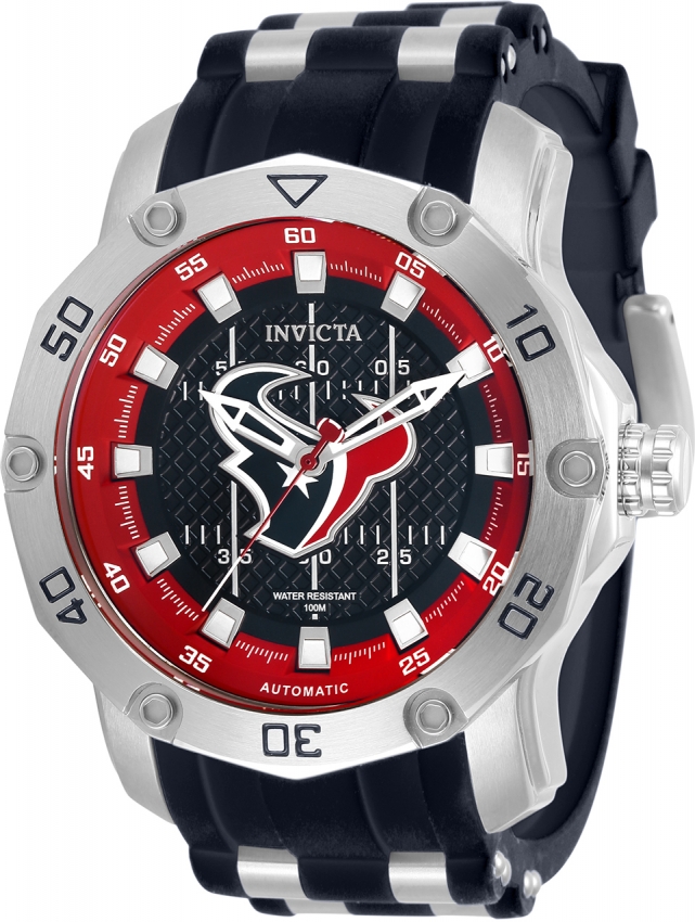 Silver-tone stainless steel case with a dark blue silicone with stainless steel barrel inserts strap. Uni-directional rotating silver-tone stainless steel bezel. Dark blue and red dial with silver-tone skeleton sword-shaped hands and index hour markers. Minute markers around the outer rim. Dial Type: Analog. Luminescent hands and markers. Miyota Caliber 821A-21D(3W) automatic movement with a 42-hour power reserve. Scratch resistant flame fusion crystal. Pull / push crown. Transparent case back. Dodecagon case shape, case size: 50 mm, case thickness: 18 mm. Band width: 26 mm, band length: 8.25 inches. Tang clasp. Water resistant at 100 meters / 330 feet. Functions: hour, minute, second. Sport watch style. Watch label: Japan Movt. Invicta NFL Houston Texans Automatic Dark Blue Dial Mens Watch 32020.