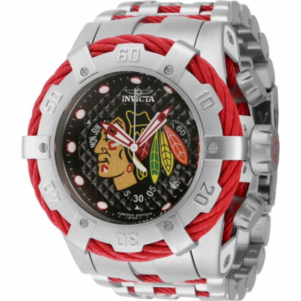 Silver-tone and red stainless steel case with a two-tone (red and silver-tone) stainless steel bracelet. Uni-directional rotating two-tone (silver-tone and red) stainless steel bezel. Green and yellow and red and orange and black dial with red hands and index hour markers. Minute markers around the outer rim. Dial Type: Analog. Luminescent hands and markers. Date display between 4 and 5 o'clock position. Three sub-dials displaying: day, 60 second and 30 minute. Ronda Caliber Z60 quartz movement. Scratch resistant mineral crystal. Screw down crown. Solid case back. Round case shape, case size: 53 mm, case thickness: 21.9 mm. Band width: 35 mm, band length: 8.25 inches. Fold over safety clasp. Water resistant at 200 meters / 660 feet. Functions: chronograph, date, day, hour, minute, small second. Nhl Series. Casual watch style. Watch label: Swiss Movt. Invicta NHL Chicago Blackhawks Chronograph Quartz Mens Watch 42013.
