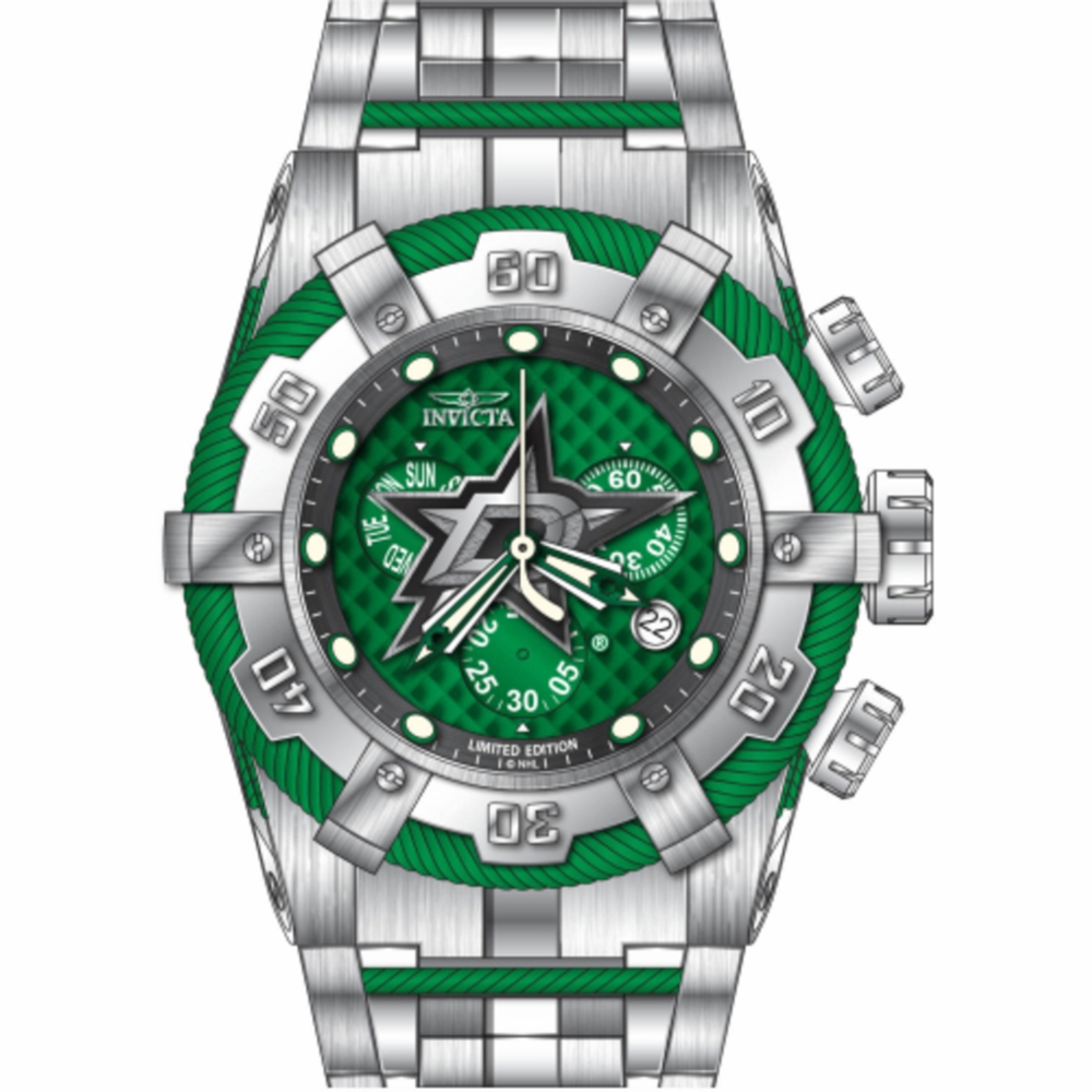 Silver-tone stainless steel case with a two-tone (green and silver-tone) stainless steel bracelet. Uni-directional rotating two-tone (silver-tone and green) stainless steel bezel. Green and silver and black dial with black hands and index hour markers. Minute markers around the outer rim. Dial Type: Analog. Luminescent hands and markers. Date display at the 4 o'clock position. Three sub-dials displaying: day, 60 second and 30 minute. Ronda Caliber Z60 quartz movement. Scratch resistant mineral crystal. Screw down crown. Solid case back. Round case shape, case size: 53 mm, case thickness: 21.9 mm. Band width: 35 mm, band length: 8.25 inches. Fold over safety clasp. Water resistant at 200 meters / 660 feet. Functions: chronograph, date, day, hour, minute, small second. Nhl Series. Casual watch style. Watch label: Swiss Movt. Invicta NHL Dallas Stars Chronograph Quartz Mens Watch 42020.