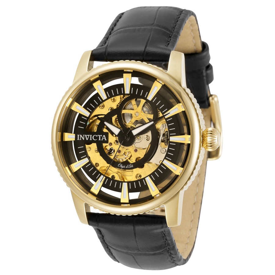 Gold-tone stainless steel case with a black leather strap. Fixed gold-tone stainless steel bezel. Black dial with black hands and index hour markers. Minute markers around the outer rim. Dial Type: Analog. Luminescent hands and markers. Caliber 2650 (Gilt) automatic movement. Scratch resistant Flame Fusion crystal. Pull / push crown. Transparent see through case back. Round case shape, case size: 42 mm, case thickness: 13 mm. Band width: 22 mm, band length: 7.75 inches. Buckle clasp. Water resistant at 50 meters / 165 feet. Functions: hour, minute, second. Objet D Art Series. Casual watch style. Invicta Objet D Art Automatic Black Dial Mens Watch 30923.