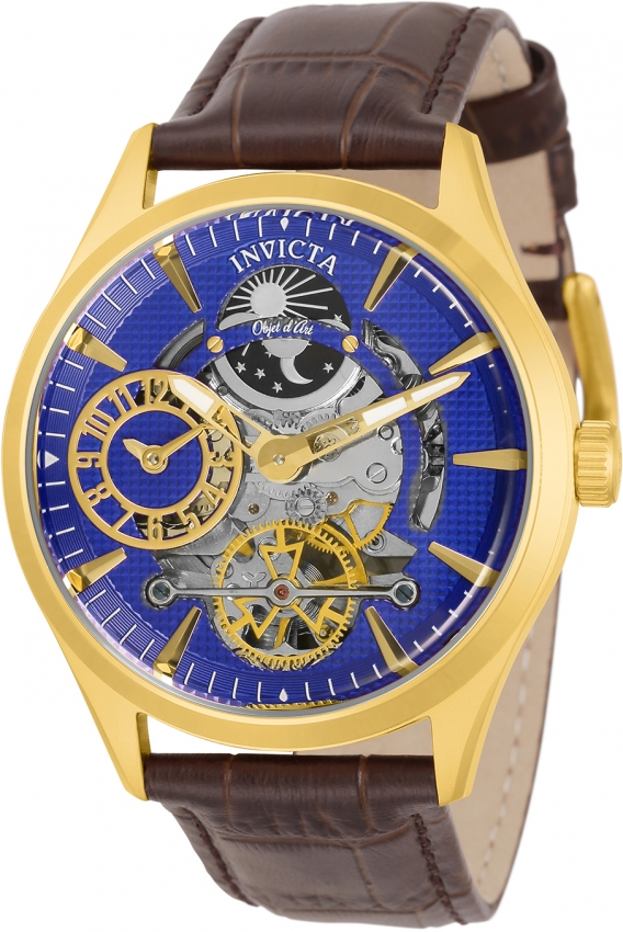 Yellow gold-tone stainless steel case with a brown leather strap. Fixed yellow gold-tone bezel. Blue (skeletonized center) dial with luminous yellow gold-tone skeleton hands and index hour markers. Minute markers around the outer rim. Dial Type: Analog. Luminescent hands and markers. Two sub-dials displaying: 12 hour and day / night indicator. Caliber Z-2031 (Nickel) automatic movement. Scratch resistant Flame Fusion crystal. Pull / push crown. Solid case back. Round case shape. Case size: 43 mm. Case thickness: 15 mm. Band width: 22 mm. Band length: 8.25 inches. Tang clasp. Water resistant at 50 meters / 165 feet. Functions: second time zone, hour, minute, day/night indicator. Objet D Art Series. Casual watch style. Invicta Objet D Art Automatic Blue Dial Mens Watch 30442.