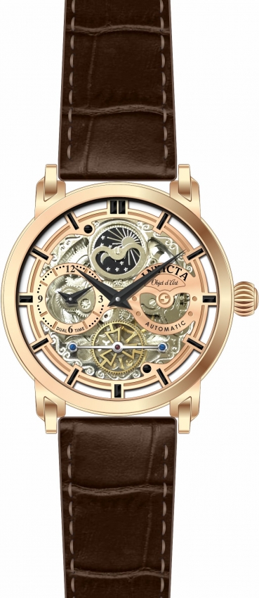Rose gold-tone stainless steel case with a brown leather strap. Fixed rose gold-tone stainless steel bezel. Rose gold-tone dial with brown dauphine-style shape hands and index hour markers. Dial Type: Analog. Two - 12 hour/60 minute, and day/night indicator subdials. Caliber Z-2031 (Nickel) automatic movement. Scratch resistant flame fusion crystal. Pull / push crown. Transparent case back. Round case shape, case size: 47 mm, case thickness: 14 mm. Band width: 24 mm, band length: 8.25 inches. Buckle clasp. Water resistant at 50 meters / 165 feet. Functions: second time zone, hour, minute, day/night indicator. Objet d art series. Dress watch style. Watch label: China Movt. Invicta Objet D Art Automatic Rose Gold-tone Dial Mens Watch 32299.