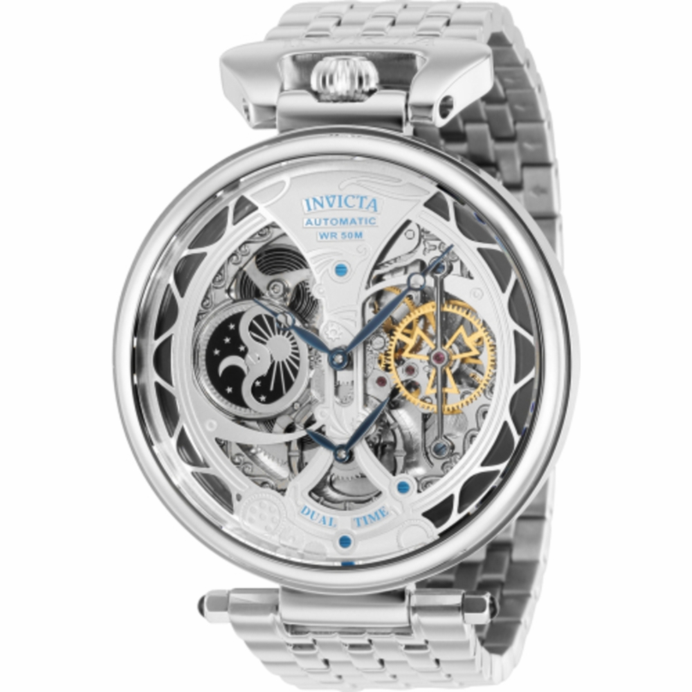 Silver-tone stainless steel case with a silver-tone and ice blue stainless steel bracelet. Fixed silver-tone stainless steel bezel. Silver-tone dial with blue hands. Dial Type: Analog. Two sub-dials displaying: 12 hour/60 minute and day/night indicator. Caliber Z-2031 (Nickel) automatic movement. Scratch resistant Flame Fusion crystal. Pull / push crown. Transparent see through case back. Round case shape, case size: 46 mm, case thickness: 14 mm. Band width: 24 mm, band length: 8 inches. Fold over clasp. Water resistant at 50 meters / 165 feet. Functions: second time zone, hour, minute, day/night indicator. Objet D Art Series. Casual watch style. Invicta Objet D Art Automatic Silver Dial Mens Watch 38325.