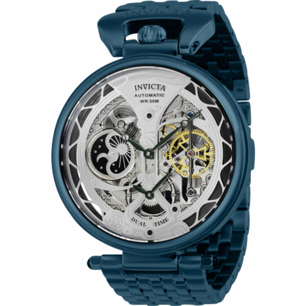 Green stainless steel case and bracelet. Fixed green stainless steel bezel. Skeleton dial with green hands. Dial Type: Analog. Two sub-dials displaying: 12 hour/60 minute and day/night indicator. Caliber Z-2031 (Nickel) automatic movement. Scratch resistant Flame Fusion crystal. Pull / push crown. Transparent case back. Round case shape, case size: 46 mm. Band width: 24mm. Hidden clasp. Water resistant at 50 meters / 165 feet. Functions: second time zone, hour, minute, day/night indicator. Objet D Art Series. Casual watch style. Invicta Objet D Art Automatic Skeleton Dial Mens Watch 38384.