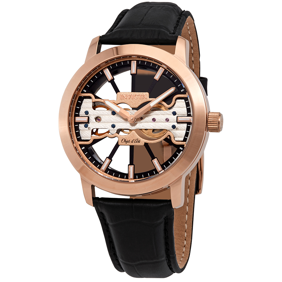 Rose gold-tone stainless steel case with a black leather strap. Fixed rose gold-tone bezel. Transparent dial with rose gold-tone hands and index hour markers. Minute markers around the outer rim. Dial Type: Analog. Luminescent hands and markers. Caliber JQ-R005 (Nickel) hand wind movement. Scratch resistant flame fusion crystal. Pull / push crown. Transparent case back. Round case shape. Case size: 45 mm. Case thickness: 12 mm. Band width: 24 mm. Tang clasp. Water resistant at 50 meters / 165 feet. Functions: hour, minute. Dress watch style. Watch label: China Movt. Invicta Objet D Art Rose Gold Dial Mens Watch 25267.