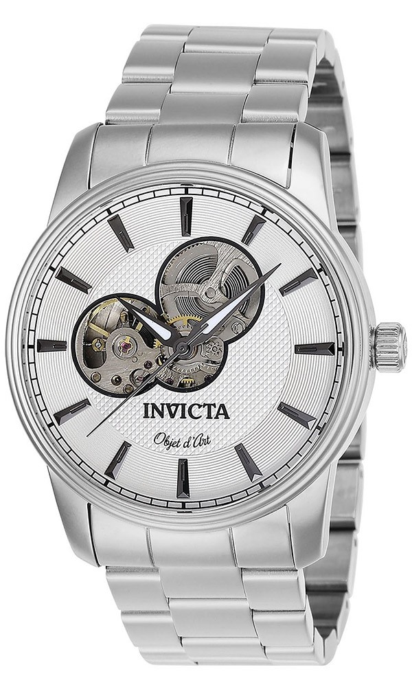 Silver-tone stainless steel case with a silver-tone stainless steel bracelet. Fixed silver-tone stainless steel bezel. Silver-tone dial with black hands and index hour markers. Minute markers around the outer rim. Dial Type: Analog. Luminescent hands. Caliber 2650 (Nickel) automatic movement. Scratch resistant flame fusion crystal. Pull / push crown. Transparent case back. Round case shape, case size: 44 mm, case thickness: 14 mm. Band width: 24, band length: 8.25 inches. Fold over clasp. Water resistant at 50 meters / 165 feet. Functions: hour, minute, second. Casual watch style. Watch label: Chinese Movt. Invicta Objet D Art Automatic Silver Dial Mens Watch 27560.