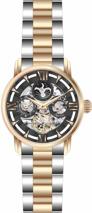 Rose gold-tone stainless steel case with a two-tone (silver-tone and rose gold-tone) stainless steel bracelet. Fixed rose gold-tone bezel. Black (skeleton center) dial with rose gold-tone hands and index hour markers. Roman numerals mark the 3, 6, 9 and 12 o'clock positions. Dial Type: Analog. 12 hour/60 minute sub-dial. Day / nigh indicator. Automatic movement. Scratch resistant mineral crystal. Pull / push crown. Transparent case back. Round case shape. Case size: 47 mm. Case thickness: 14.5 mm. Band width: 24 mm. Fold over clasp. Water resistant at 50 meters / 165 feet. Functions: second time zone, hour, minute, day/night indicator. Objet D Art Series. Casual watch style. Invicta Objet D Art Automatic Black Dial Mens Watch 27579.