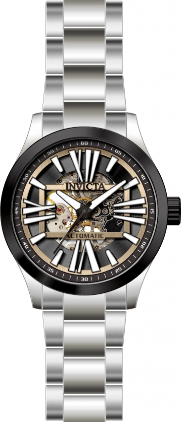 Two-tone (silver-tone and black) stainless steel case with a silver-tone stainless steel bracelet. Black stainless steel bezel. Rose gold and gunmetal dial with black hands and Roman numeral and index hour markers. Minute markers around the outer rim. Dial Type: Analog. Caliber 2650 (Nickel) automatic movement. Scratch resistant flame fusion crystal. Pull / push crown. Round case shape. Case size: 48 mm. Band width: 24 mm, band length: 8 inches. Water resistant at 100 meters / 330 feet. Functions: hour, minute, second. Casual watch style. Invicta Objet D Art Automatic Mens Watch 32740.