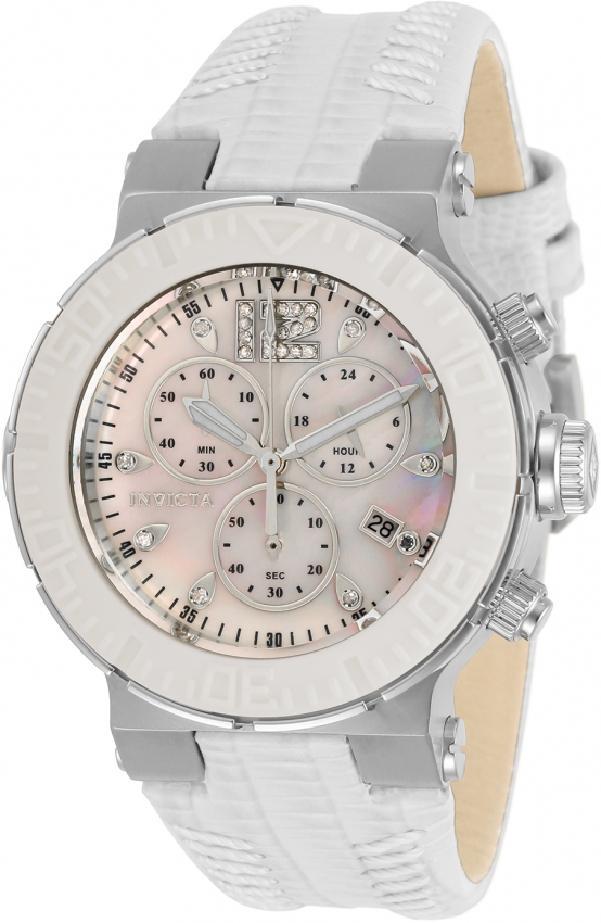 White and silver-tone stainless steel case with a white leather strap. Uni-directional rotating silver-tone stainless steel bezel. White mother of pearl dial with silver-tone hands and Arabic numeral and index hour markers. Minute markers around the outer rim. Dial Type: Analog. Luminescent hands. Date display at the 4 o'clock position. Chronograph - three sub-dials displaying: 60 second, 60 minute and 24 hours. Miyota Caliber FS00 quartz movement. Scratch resistant flame fusion crystal. Screw down crown. Solid case back. Round case shape, case size: 40 mm, case thickness: 14 mm. Band width: 24 mm, band length: 8 inches. Buckle clasp. Water resistant at 200 meters / 660 feet. Functions: chronograph, date, hour, minute, small second. Ocean reef series. Sport watch style. Watch label: Japan Movt. Invicta Ocean Reef Chronograph Quartz White Mother Of Pearl Dial Ladies Watch 10723.