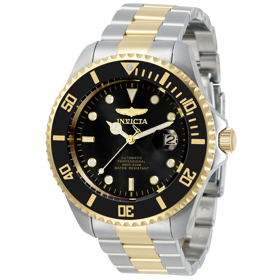 Silver-tone and gold stainless steel case with a two-tone (silver-tone and gold-tone) stainless steel bracelet. Uni-directional rotating black stainless steel bezel. Black dial with gold-tone Mercedes-logo and Breguet-style shape hands and index hour markers. Minute markers around the outer rim. Dial Type: Analog. Luminescent hands and markers. Date display at the 3 o'clock position. SII Caliber NH35A Automatic movement, containing 24 Jewels, bitting at 21600 vph, and has a power reserve of approximately 41 hours. Scratch resistant mineral crystal. Screw down crown. Transparent see through case back. Round case shape, case size: 47 mm, case thickness: 15.6 mm. Band width: 22 mm, band length: 8.50 inches. Fold over clasp. Water resistant at 200 meters / 660 feet. Functions: date, hour, minute, second. Pro Diver Series. Casual watch style. Watch label: Japan Movt. Invicta Pro Diver Automatic Black Dial Mens Watch 34041.