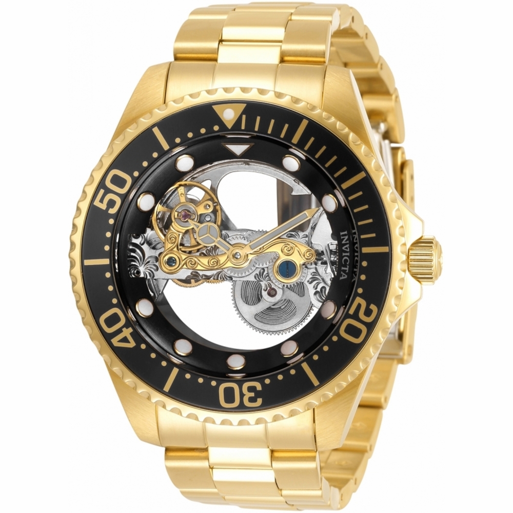 Gold-tone stainless steel case and bracelet. Uni-directional rotating gold-tone bezel with an inlaid black ring. Black (transparent) dial with luminous gold-tone hands and dot hour markers. Dial Type: Analog. Luminescent hands and markers. Caliber LG0802B automatic movement. Scratch resistant mineral crystal. Pull / push crown. Transparent case back. Round case shape. Case size: 47 mm. Case thickness: 16 mm. Band width: 22 mm, band length: 8.50 inches. Fold over clasp. Water resistant at 100 meters / 330 feet. Functions: hour, minute, second. Pro Diver Series. Casual watch style. Invicta Pro Diver Automatic Black Dial Mens Watch 34447.