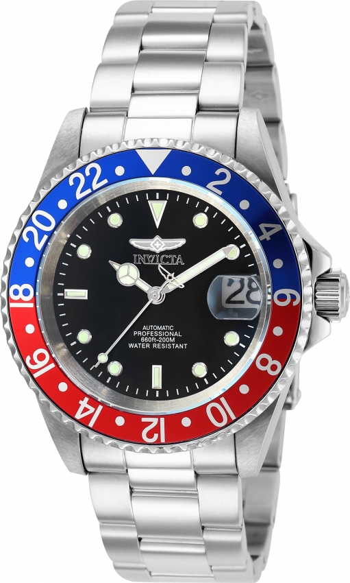 Stainless steel case with a stainless steel bracelet. Uni-directional rotating stainless steel bezel with an inalid blue and red (Pepsi) ring. Black dial with luminous silver-tone Mercedes-logo and Breguet-style shape hands and dot hour markers. Minute markers around the outer rim. Dial Type: Analog. Luminescent hands and markers. Date display at the 3 o'clock position. SII caliber NH35A automatic movement, containing 24 Jewels, bitting at 21600 vph, and has a power reserve of approximately 41 hours. Scratch resistant sapphire crystal. Screw down crown. Transparent case back. Round case shape. Case size: 40 mm. Case thickness: 14 mm. Band width: 20 mm. Band length: 8 inches. Fold over clasp. Water resistant at 200 meters / 660 feet. Functions: date, hour, minute, second. Pro Diver Series. Casual watch style. Watch label: Japan Movt. Invicta Pro Diver Automatic Black Dial Pepsi Bezel Mens Watch 8926BRB.