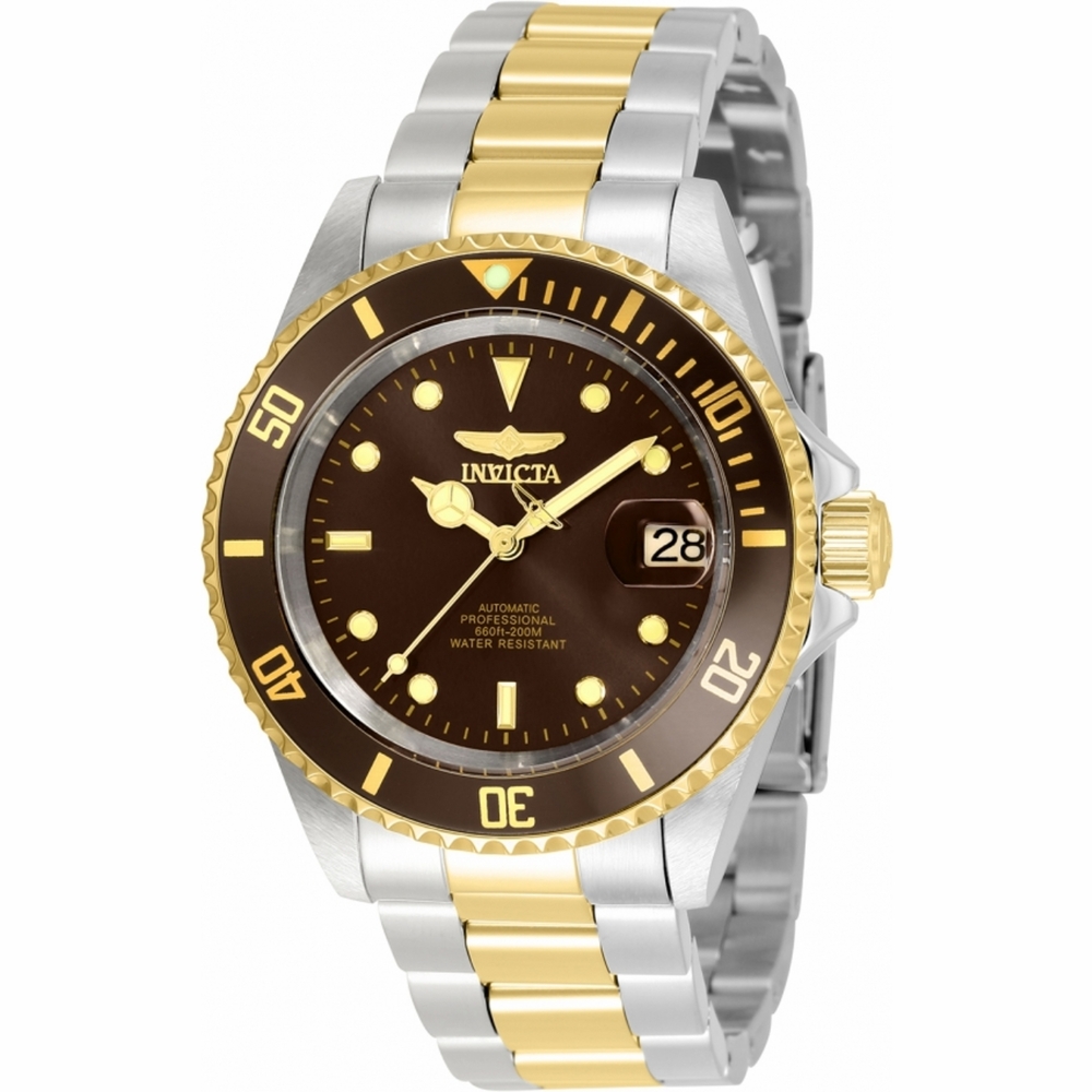 Stainless steel case with a two-tone (silver-tone and gold-tone) stainless steel bracelet. Uni-directional rotating gold-tone bezel with an inlaid desert sand ring. Desert sand dial with luminous gold-tone Mercedes-logo and Breguet-style shape hands and dot hour markers. Minute markers around the outer rim. Dial Type: Analog. Luminescent hands and markers. Date display at the 3 o'clock position. SII caliber NH35A automatic movement, containing 24 Jewels, bitting at 21600 vph, and has a power reserve of approximately 41 hours. Scratch resistant mineral crystal. Screw down crown. Transparent case back. Round case shape. Case size: 40 mm. Case thickness: 14.5 mm. Band width: 20 mm. Band length: 8 inches. Fold over clasp. Water resistant at 200 meters / 660 feet. Functions: date, hour, minute, second. Pro Diver Series. Casual watch style. Watch label: Japan Movt. Invicta Pro Diver Automatic Brown Dial Mens Watch 35701.