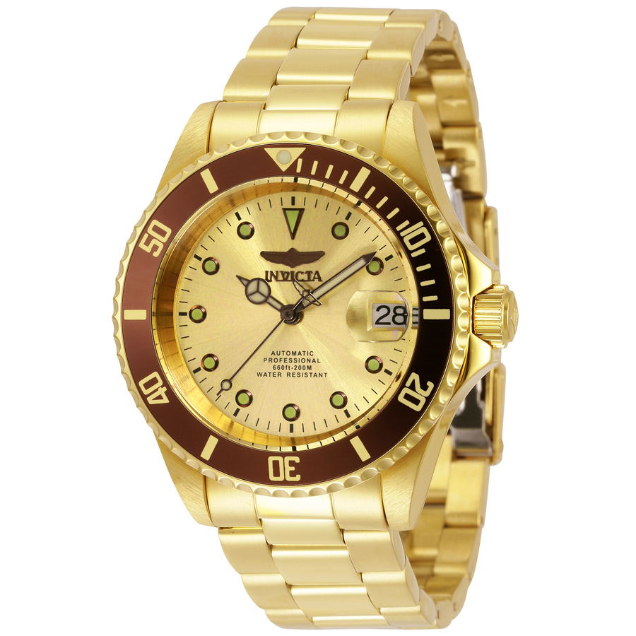 Yellow gold-tone stainless steel case and bracelet. Uni-directional rotating yellow gold-tone bezel with an inlaid brown ring. Gold dial with luminous brown hands and index hour markers. Minute markers around the outer rim. Dial Type: Analog. Luminescent hands and markers. Date display at the 3 o'clock position. SII caliber NH35A automatic movement, containing 24 Jewels, bitting at 21600 vph, and has a power reserve of approximately 41 hours. Scratch resistant mineral crystal. Screw down crown. Transparent case back. Round case shape. Case size: 40 mm. Case thickness: 14 mm. Band width: 20 mm. Band length: 8 inches. Fold over clasp. Water resistant at 200 meters / 660 feet. Functions: date, hour, minute, second. Pro Diver Series. Casual watch style. Watch label: Japan Movt. Invicta Pro Diver Automatic Gold Dial Mens Watch 34766.