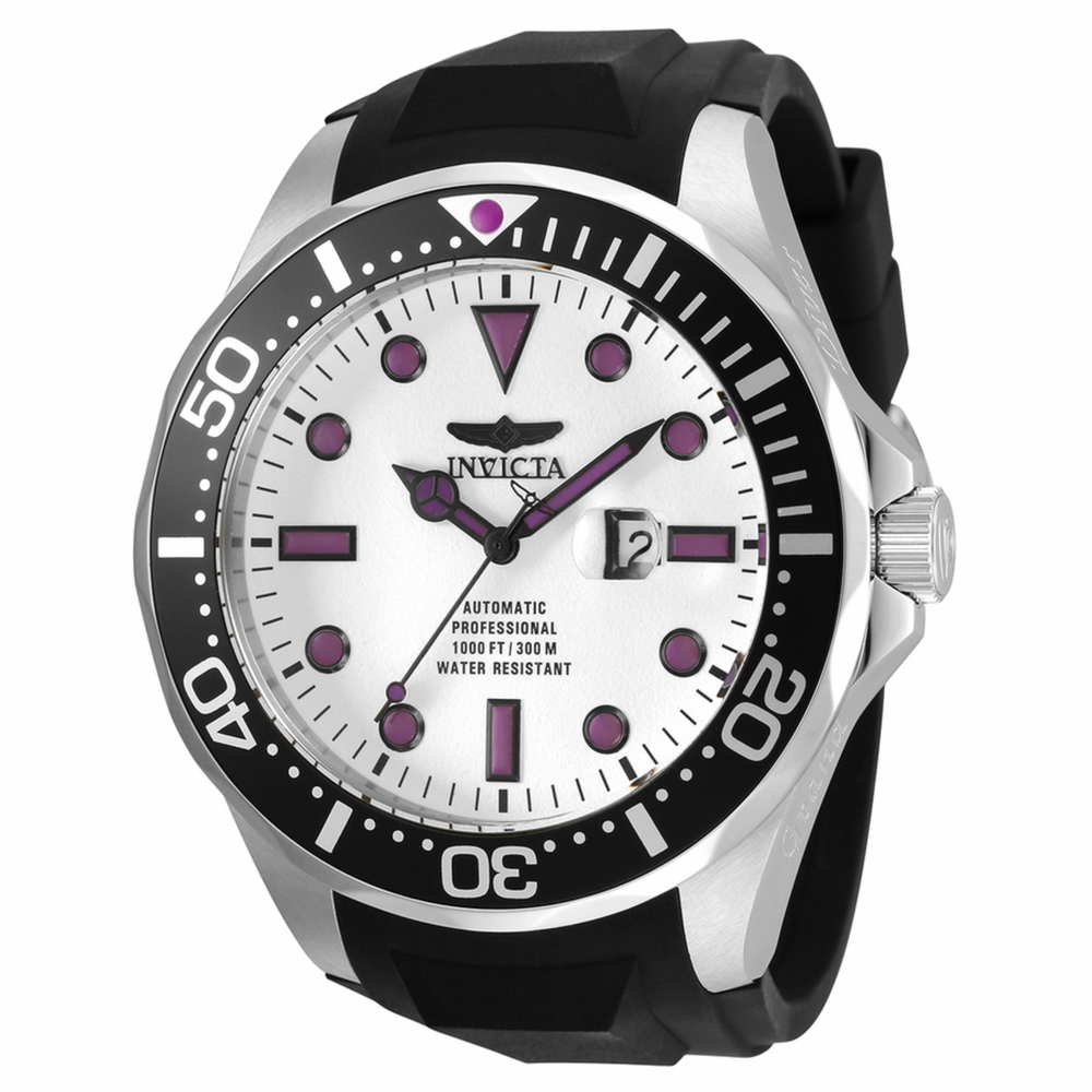 Stainless steel case with a black silicone strap. Uni-directional rotating stainless steel bezel with an inlaid black ring. White dial with luminous black Mercedes-logo and Breguet-style hands and dot hour markers. Minute markers around the outer rim. Dial Type: Analog. Luminescent hands and markers. Date display at the 3 o'clock position. SII caliber NH35A automatic movement, containing 24 Jewels, bitting at 21600 vph, and has a power reserve of approximately 41 hours. Scratch resistant mineral crystal. Screw down crown. Transparent case back. Round case shape. Case size: 60 mm. Case thickness: 14.4 mm. Band width: 28 mm. Band length: 9.25 inches. Tang clasp. Water resistant at 300 meters / 1000 feet. Functions: date, hour, minute, second. Pro Diver Series. Dive watch style. Watch label: Japan Movt. Invicta Pro Diver Automatic White Dial Mens Watch 36434.