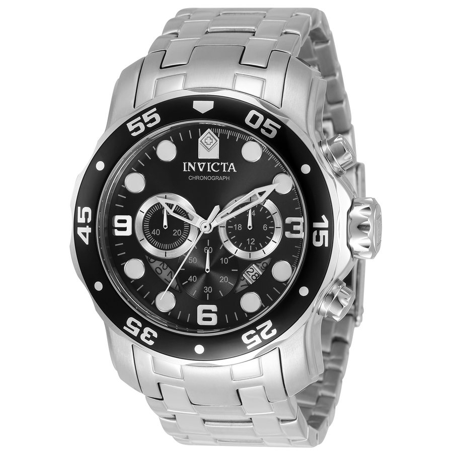 Plunge into any horizon using the steadfast guidance of the Invicta Pro Diver. Stylishly classic internal workings are forged with variations of bold movements. Built with confident prowess the fortitude with which these timepieces function makes the Pro Diver the quintessential in performance. Silver-tone stainless steel case and bracelet. Uni-directional rotating silver-tone and black and white stainless steel bezel. Black dial with silver-tone hands and index-Arabic numeral hour markers. Minute markers around the outer rim. Dial Type: Analog. Luminescent hands and markers. Date display between 4 and 5 o'clock position. Chronograph - three sub-dials displaying: 60 second, 60 minute and 24 hour. Hattori Caliber VD53 quartz movement. Scratch resistant Flame Fusion crystal. Pull / push crown. Solid case back. Round case shape, case size: 48 mm, case thickness: 16.7 mm. Band width: 26 mm, band length: 7.50 inches. Fold over clasp. Water resistant at 100 meters / 330 feet. Functions: chronograph, date, GMT, second time zone, hour, minute, second. Pro Diver Series. Sport watch style. Watch label: Japan Movt. Invicta Pro Diver Chronograph Quartz Black Dial Mens Watch 34665.