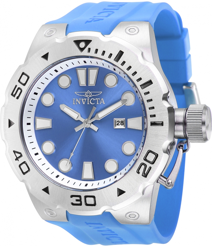 Stainless steel case with a blue silicone strap. Fixed stainless steel bezel. Blue dial with luminous silver-tone hands and dot hour markers. Minute markers around the outer rim. Dial Type: Analog. Luminescent hands and markers. Date display at the 3 o'clock position. Hattori caliber PC32 quartz movement. Scratch resistant Flame Fusion crystal. Pull / push crown. Solid case back. Round case shape. Case size: 51 mm. Case thickness: 14.5 mm. Band width: 32 mm. Band length: 8.50 inches. Fold over clasp. Water resistant at 100 meters / 330 feet. Functions: date, hour, minute, second. Pro Diver Series. Casual watch style. Watch label: Japan Movt. Invicta Pro Diver Quartz Blue Dial Mens Watch 36994.