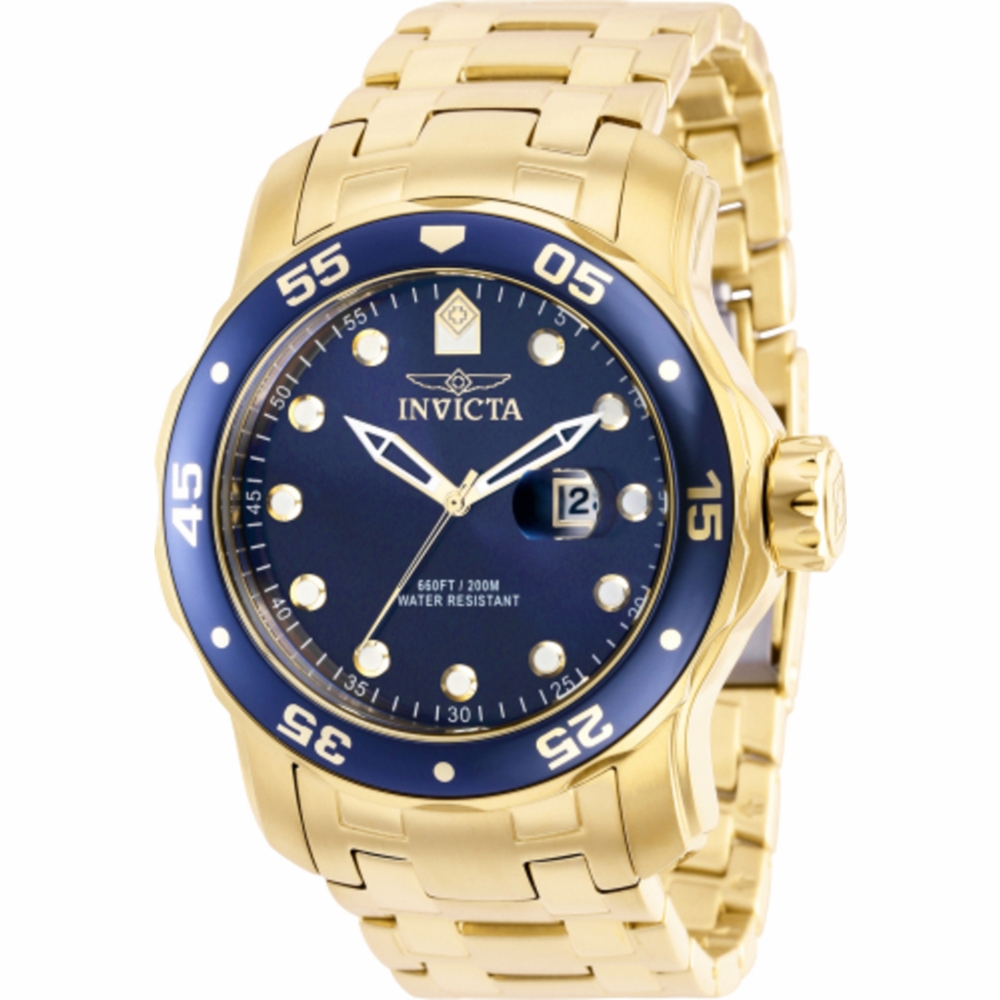 Gold-tone stainless steel case and bracelet. Uni-directional rotating gold and blue stainless steel bezel. Blue dial with gold-tone hands and dots hour markers. Minute markers around the outer rim. Dial Type: Analog. Luminescent hands and markers. Date display at the 3 o'clock position. Hattori Caliber PC32 quartz movement. Scratch resistant Flame Fusion crystal. Pull / push crown. Solid case back. Round case shape, case size: 48 mm, case thickness: 16.7 mm. Band width: 26 mm, band length: 7.50 inches. Fold over clasp. Water resistant at 100 meters / 330 feet. Functions: date, hour, minute, second. Pro Diver Series. Casual watch style. Watch label: Japan Movt. Invicta Pro Diver Blue Dial Mens Watch 39086.
