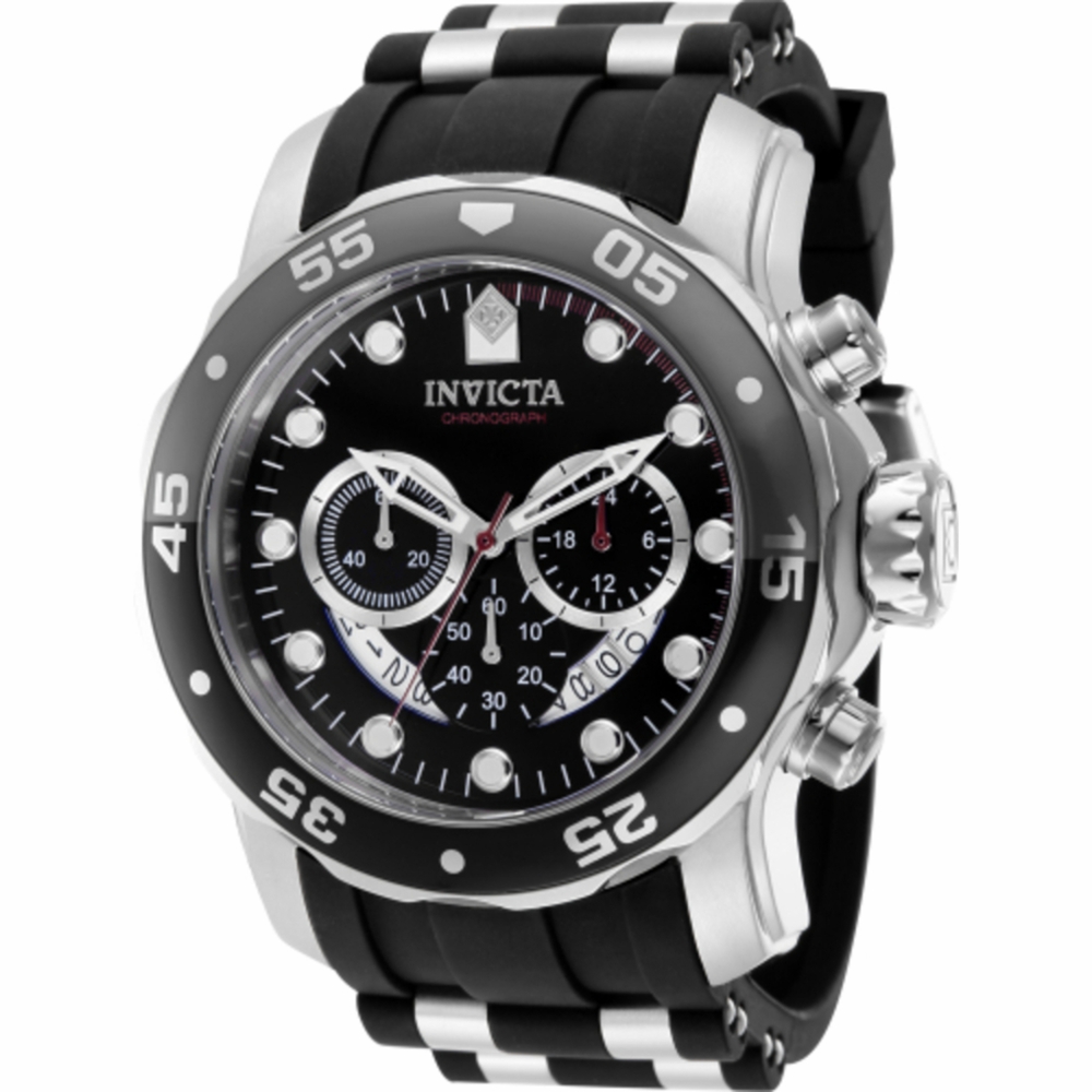 Silver-tone stainless steel case with a two-tone (black and silver-tone) silicone strap. Uni-directional rotating grey and silver-tone and black aluminum and stainless steel bezel. Black dial with silver-tone hands and index hour markers. Minute markers around the outer rim. Dial Type: Analog. Luminescent hands and markers. Date display between 4 and 5 o'clock position. Chronograph - three sub-dials displaying: 60 second, 60 minute and 24 hour. Hattori Caliber VD53 quartz movement. Scratch resistant Flame Fusion crystal. Pull / push crown. Solid case back. Round case shape, case size: 48 mm, case thickness: 16.8 mm. Band width: 26 mm, band length: 8.75 inches. Buckle clasp. Water resistant at 100 meters / 330 feet. Functions: chronograph, date, GMT, second time zone, hour, minute, second. Pro Diver Series. Casual watch style. Watch label: Japan Movt. Invicta Pro Diver Chronograph Quartz Black Dial Mens Watch 37230.