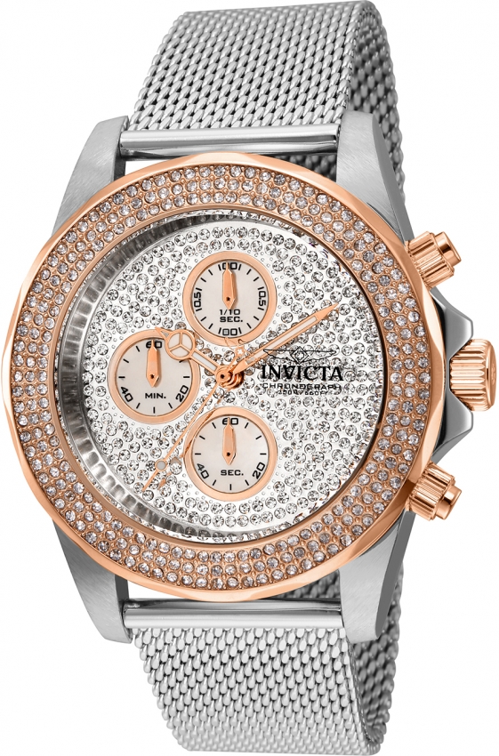 Two-tone (silver-tone and rose gold-tone) stainless steel case with a silver-tone stainless steel bracelet. Fixed rose gold-tone bezel with crystal set. White and silver dial with rose gold-tone Mercedes-logo and Breguet-style shape hands. Dial Type: Analog. Luminescent hands. Chronograph - three sub-dials displaying: 60 second, 60 minute and 1/10th of a second. SII Caliber VD55B quartz movement. Scratch resistant Flame Fusion crystal. Screw down crown. Solid case back. Round case shape, case size: 43 mm, case thickness: 12.7 mm. Band width: 22 mm, band length: 8.75 inches. Jewelry clasp. Water resistant at 200 meters / 660 feet. Functions: chronograph, hour, minute, second. Pro Diver Series. Dress watch style. Watch label: Japan Movt. Invicta Pro Diver Chronograph Quartz Crystal Mens Watch 31569.